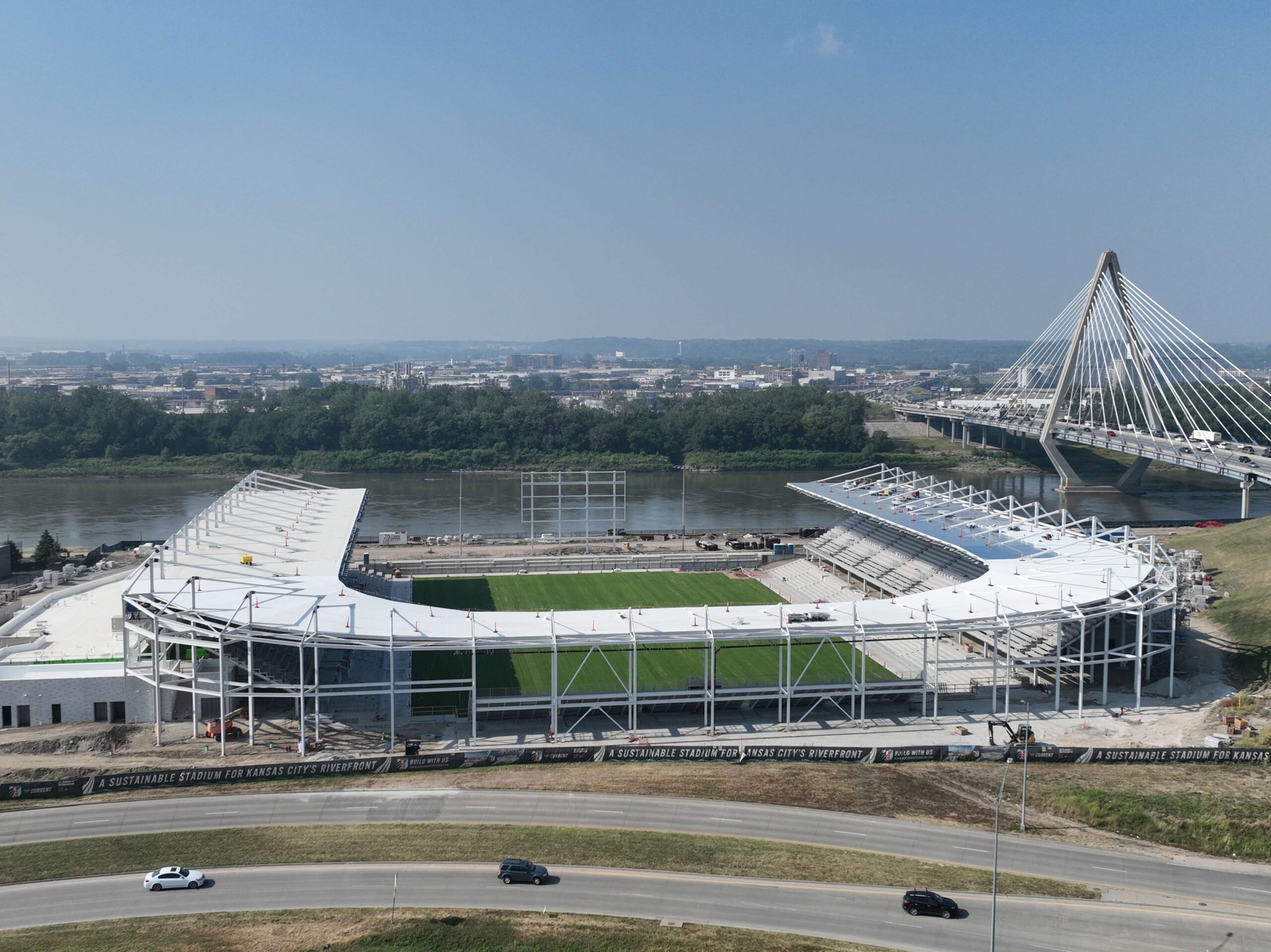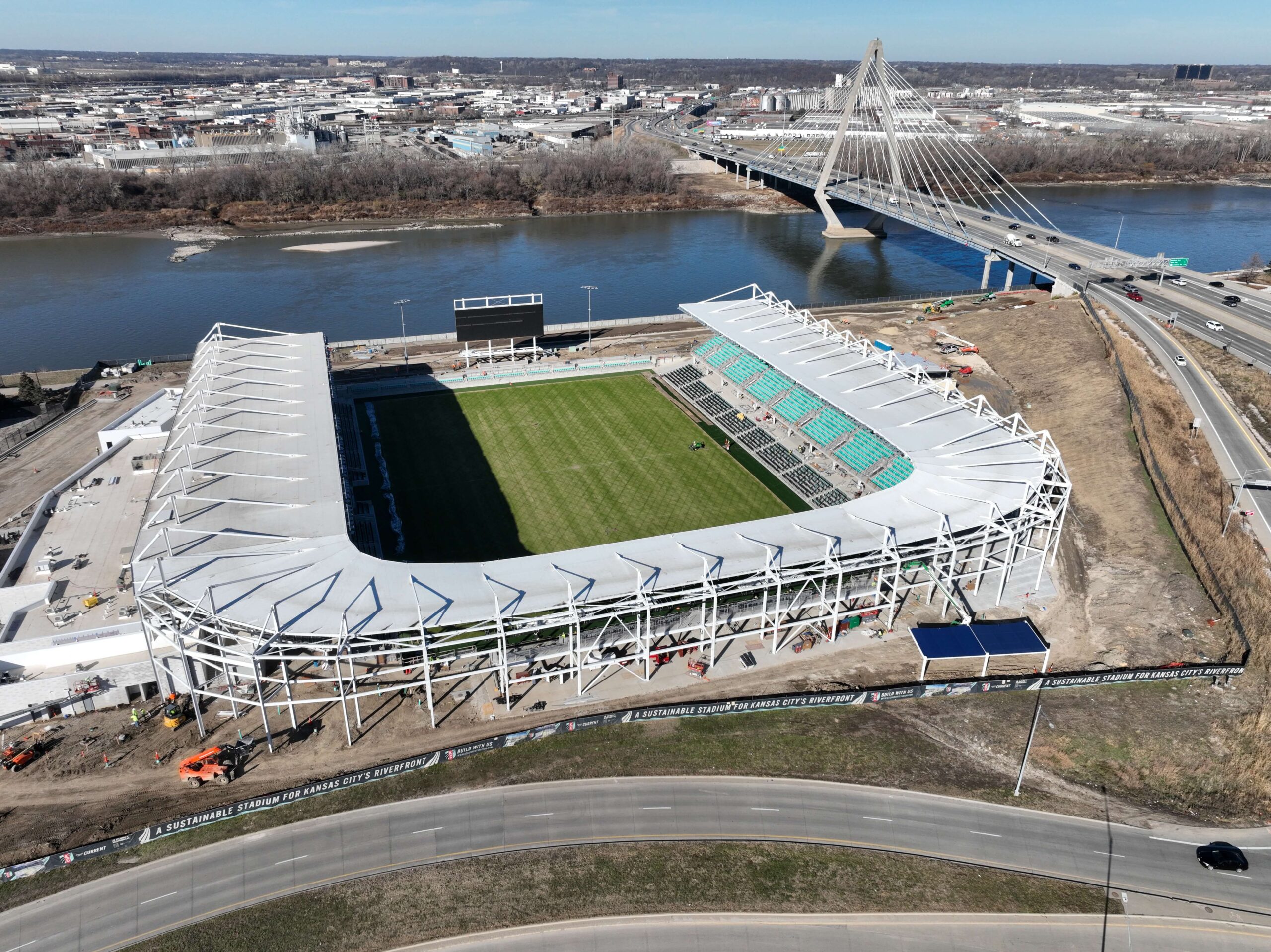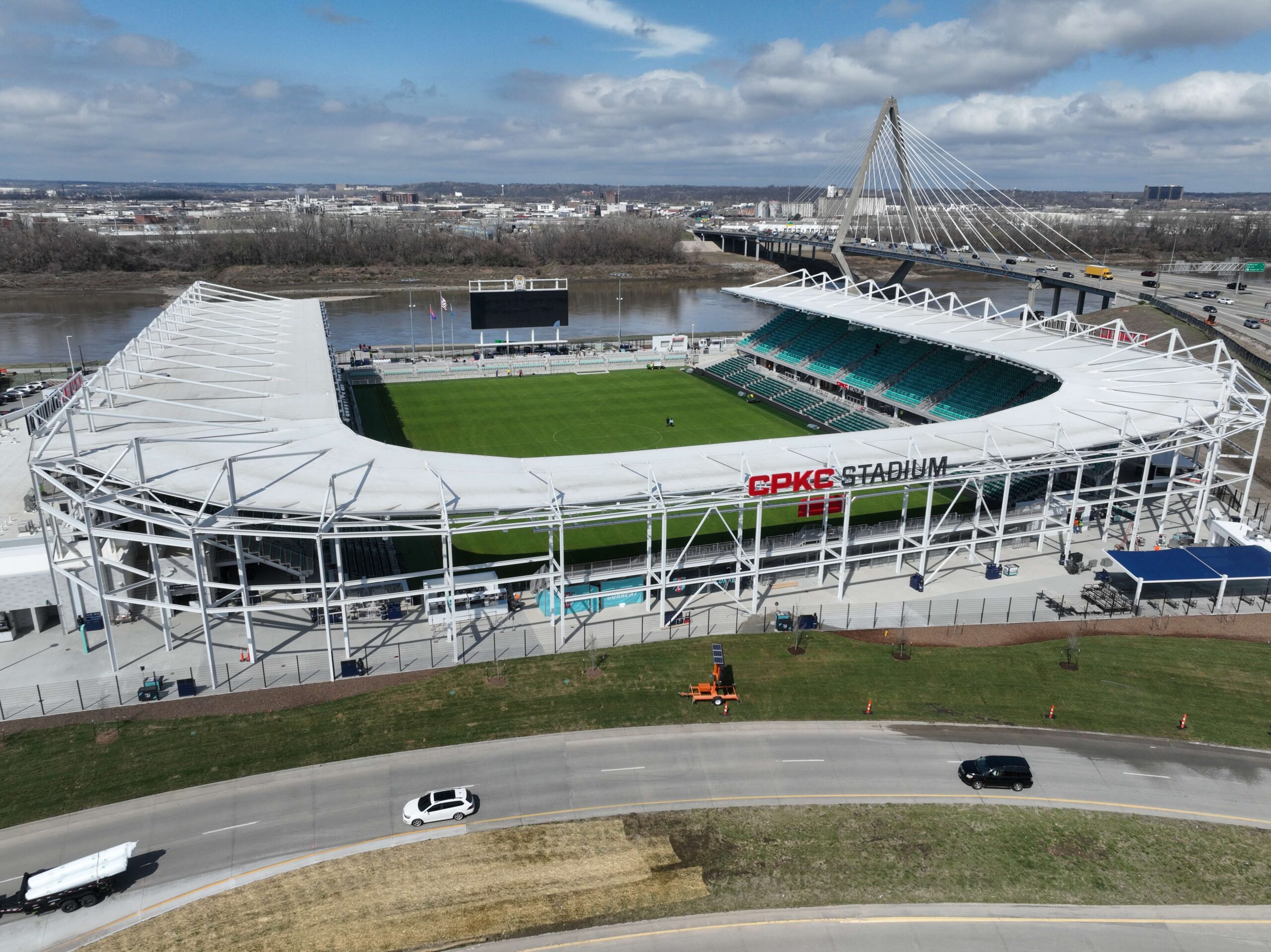 Aerial of CPKC Stadium, green field, parking, river, bridge.