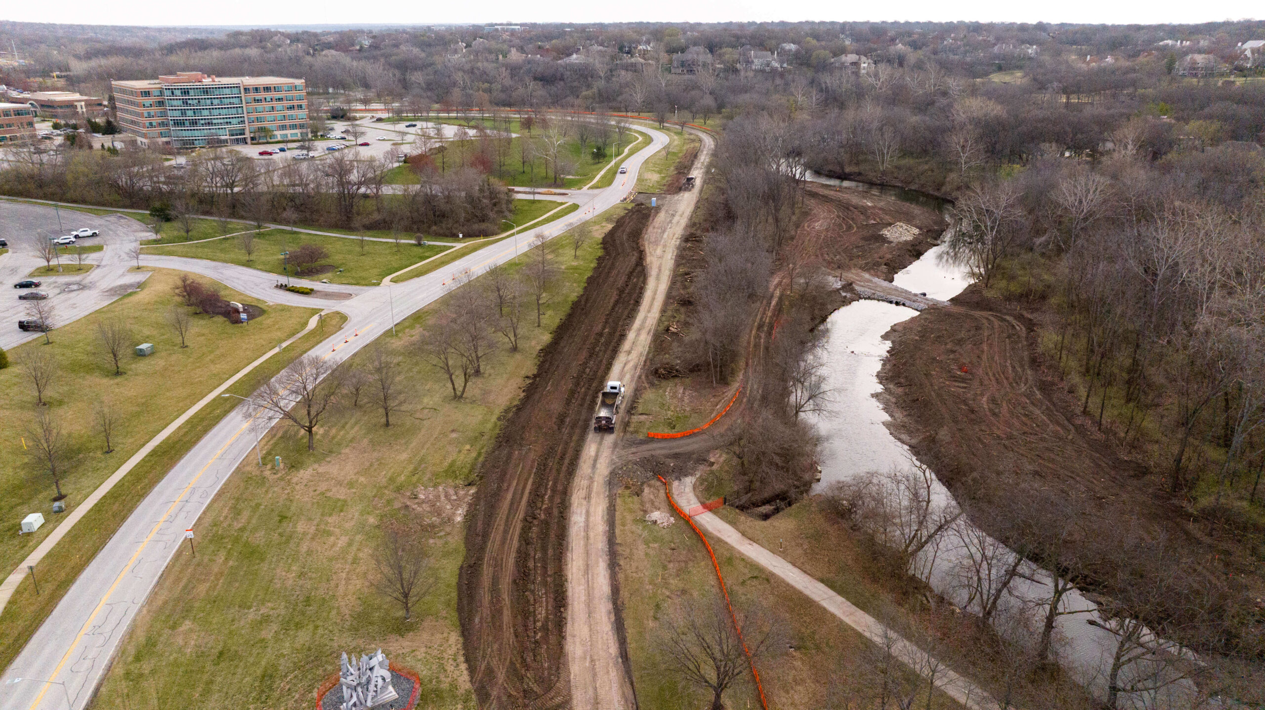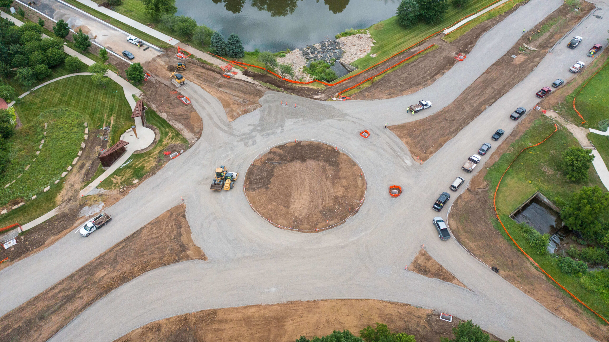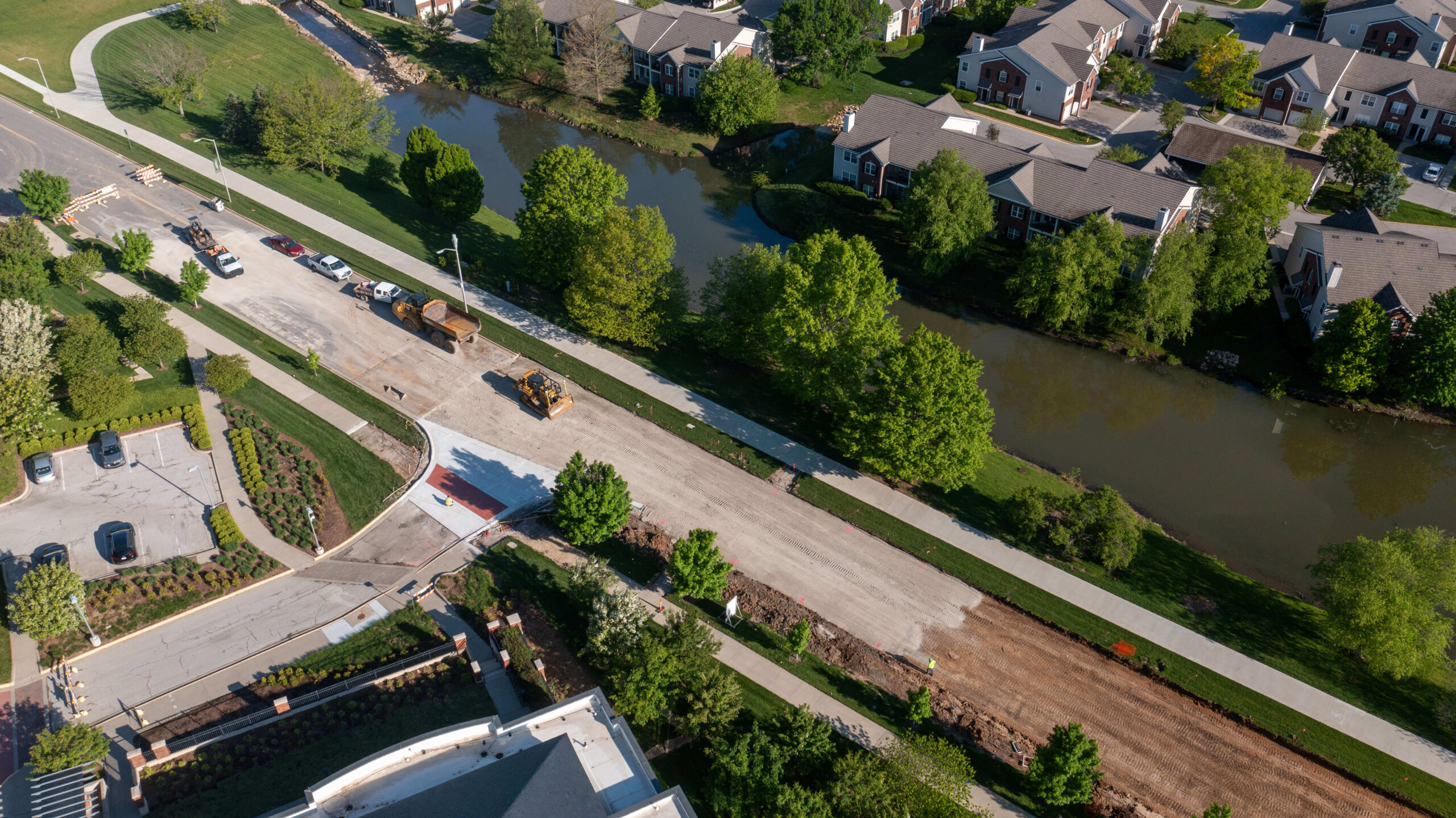 In addition to our creek enhancement work, Superior Bowen rebuilt the main road and a beloved community walking trail. To get the parkway out of the 100-year floodplain, we tore out and elevated the existing pavement. Our scope included the addition of a roundabout at the parkway’s intersection with Town Center Drive. By the time the project concluded, our team had improved water flow and traffic flow for the citizens of Leawood.